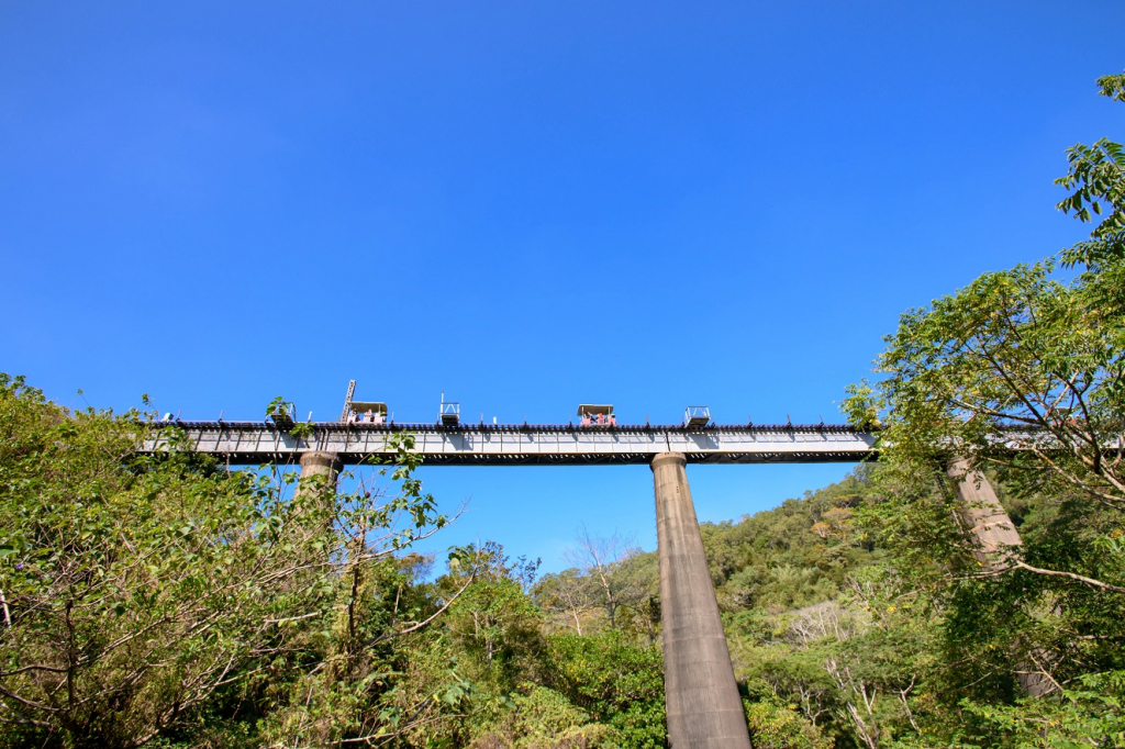 Sebagian besar rutenya merupakan jalur tunggal, dan tak lama kemudian kami melintasi jembatan sempit yang jauh di atas sungai kecil di gunung. Bila menengok ke kiri, kami bisa menikmati salah satu pemandangan terfavorit Miaoli: Jembatan Longteng, a.k.a. Jembatan Yutengping.